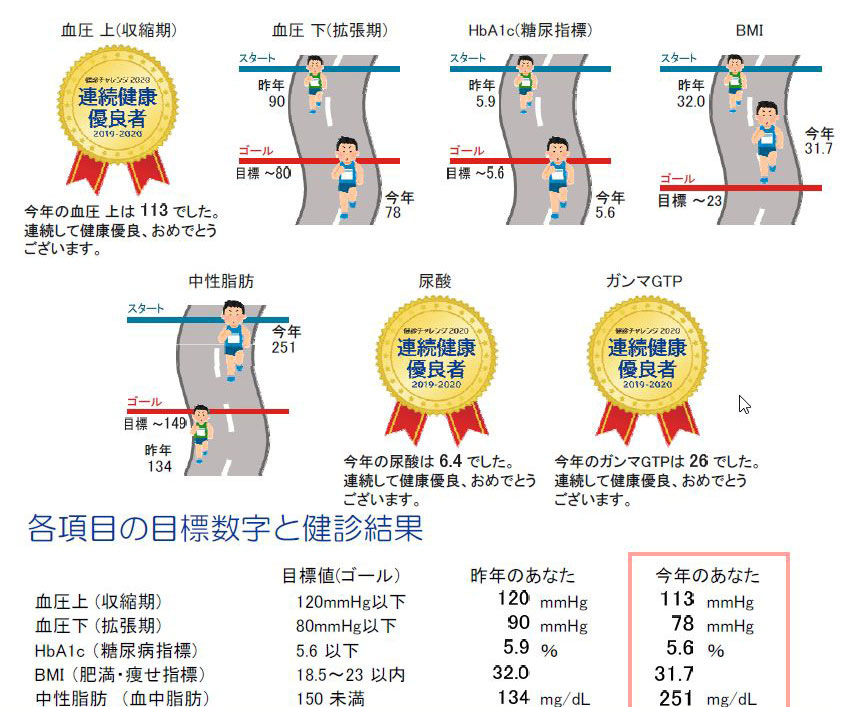 概要: 健康診断は多くの場合、「~が悪い」「~が高い」など、何かとネガティブな結果に一喜一憂しがちなイメージがありますが、 その一方で、健康に自信があって毎年の健康診断が楽しみという方も、意外に多いようです。 健康診断の結果が正常であることはすばらしいことであり、そのような方々を積極的に褒めて、健康を維持してもらうことは、 重症者のケアと同じぐらい大切です。 利用項目と操作: ・保険証システムの適用情報から作成した人物マスタ ・過去数年分の健診結果と社内判定の結果、および差分計算 データ確認事項: 複数年(入社後年数などは調整)にわたり、サリューテ2の判定などで優良と分類された方を抽出します。 確認対象と複数項目にするなど、広く健康優良を見つけること、加齢の条件も加味して、判断をすることで、 より誉めるべき対象者が見つかります。 対応と実施: 褒める方法として、ゲーム性を持たせた競争やプレゼントなどの具体的なものが励みになり効果的です。 しかし、健康数値は他人と比較してランキングを付けるのではなく、昨年の結果と比較するなど、過去対現在など 自己完結した良し悪しの評価が良いと思われます。 改善方法などは意識が高くなることで、ちょっとしたヒントでも大きな効果を引き出すことがあります。 ![]() 過去の自分と現在を比較した通知サンプル |